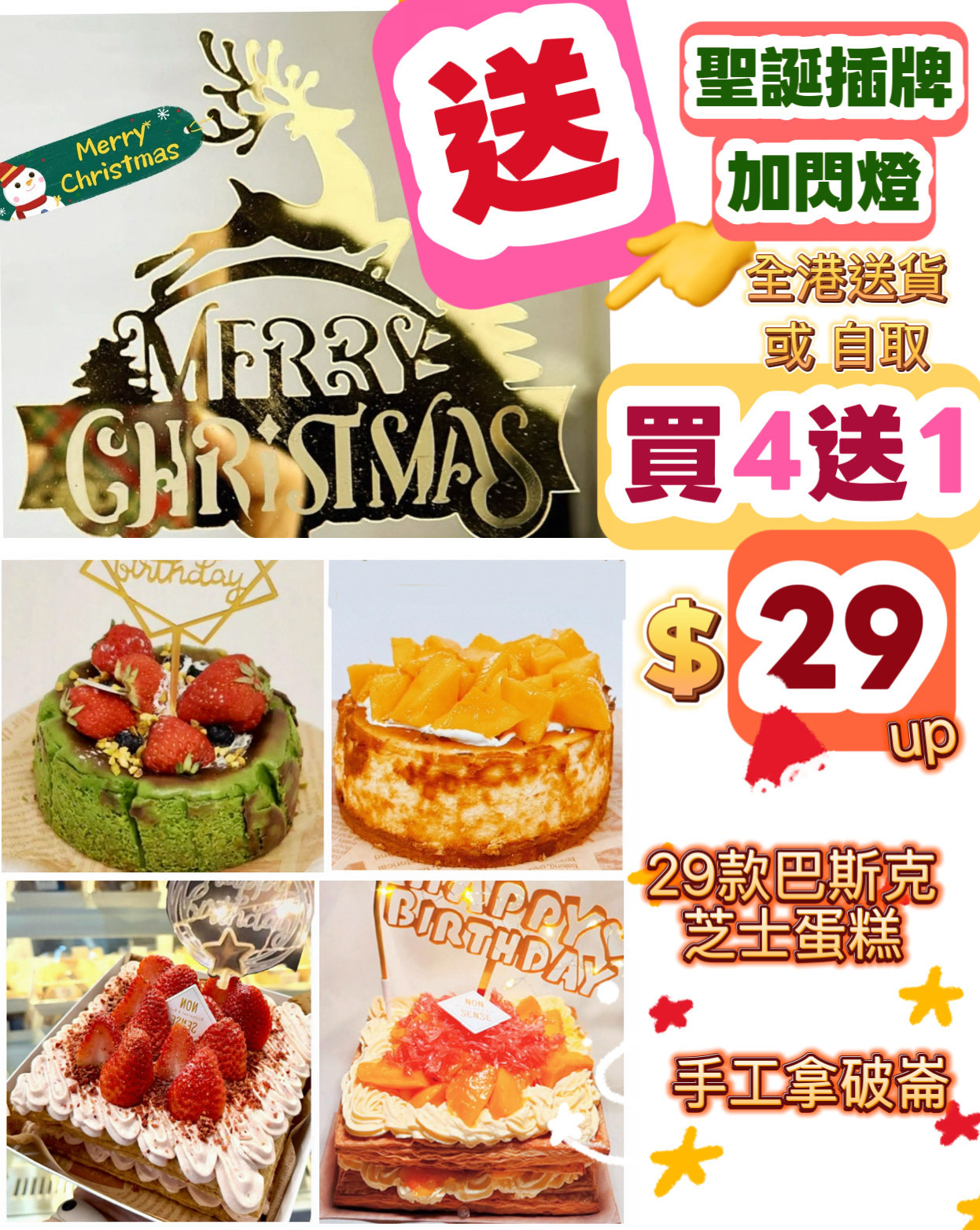 ⭐️如需要生日插牌+閃牌 (請於備註註明), 或現場向店員索取, 任何原個蛋糕(或4件切件)都可送贈生日閃燈插牌+閃燈