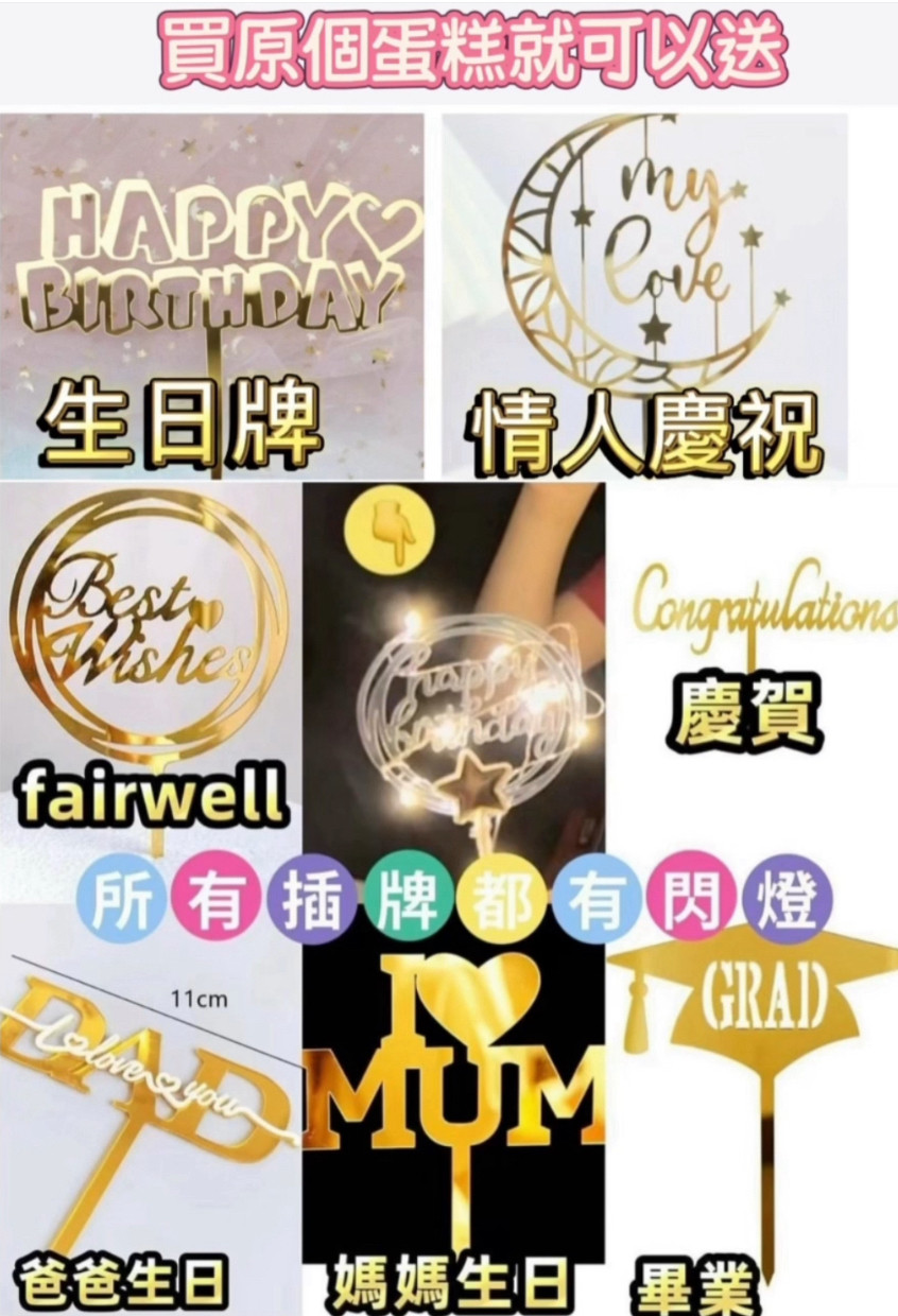 💝 原個蛋糕優惠 可送生日閃燈套裝👉👉🔥🔥生日金色插牌 + 蠟燭+閃燈, 也有其他慶祝的蛋糕插牌。
