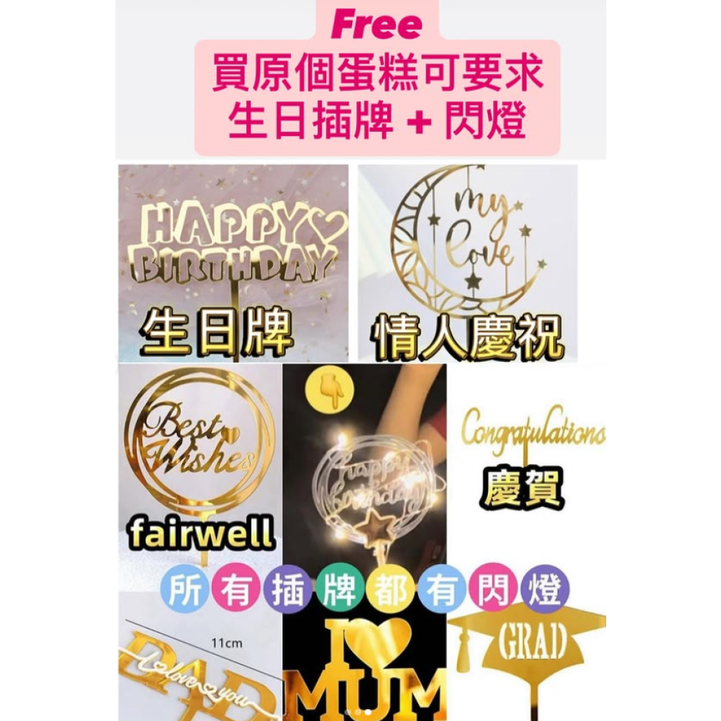 生日/慶賀的蛋糕插牌 (free)/ 生日蛋糕禮盒 / 都可以一站式「即日」 walk-in 我們的店就可以買到! 當然客戶也可以3日前預訂。